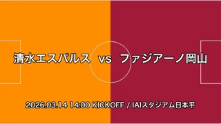 J1-WEST 清水エスパルス vs ファジアーノ岡山 試合展望(2026年3月14日) 戦力比較から、ホームの清水エスパルスがやや有利と見られる。直近の試合ではアイスタでの勝利を挙げているものの、PK戦での連敗が気掛かりだ。 2026.03.13 J1-WEST明治安田Jリーグ百年構想リーグ