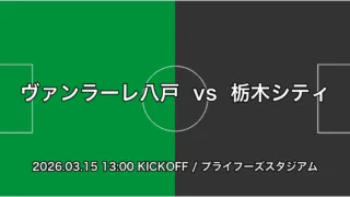 EAST-A ヴァンラーレ八戸 vs 栃木シティ 試合展望(2026年3月15日) 戦力比較から、ホームのヴァンラーレ八戸が優位と見られる。八戸はプライフーズスタジアムでの安定感があり、アウェイ戦では栃木シティが苦戦している。 2026.03.13 EAST-A明治安田Jリーグ百年構想リーグ